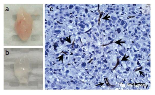 (a,c)用100μL 基質(zhì)膠混合2x105 PC3細胞,接種到SCID小鼠中9天后血管和腫瘤細胞的生長情況,(c)箭頭所指為CD31標記的表皮細胞,顯示了腫瘤內(nèi)廣泛的血管形成。(b)為不加PC3細胞的對照。