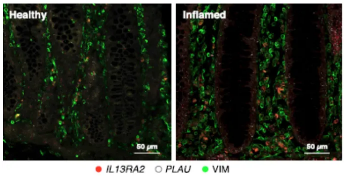 盡管大多數(shù)成纖維細胞亞群同時存在于健康個體和UC患者中,但一類稱之為炎癥相關(guān)成纖維細胞(IAFs)的亞群在一些病人的炎癥組織中表達擴大了189倍。IAFs富含許多與結(jié)腸炎、纖維化和癌癥相關(guān)的基因,包括IL11、IL24和IL13RA2。研究人員就利用RNAscope原位雜交技術(shù)檢測了健康組織與炎癥組織中的炎癥相關(guān)成纖維細胞的特征基因表達,證實了表達IL13RA2的炎癥相關(guān)成纖維細胞在炎癥組織中的表達遠高于正常組織(見下圖,紅色為RNAscope檢測到的IL13RA2的RNA信號)。