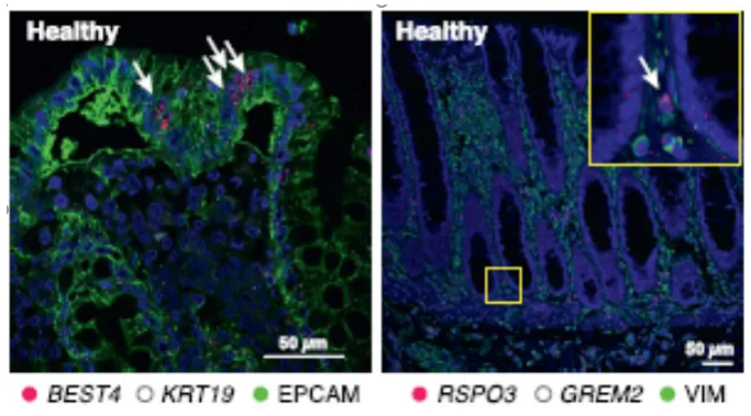 2019年來自麻省理工學(xué)院和哈佛大學(xué)的研究學(xué)者在《Cell》雜志上發(fā)表的一篇研究論文揭示了潰瘍性結(jié)腸炎的耐藥機制[1]。在這項研究中,研究人員利用scRNA-seq從18例潰瘍性結(jié)腸炎(UC)患者和12例健康人的結(jié)腸粘膜中生成了366,650個細胞的圖譜,以此來了解細胞類型特異性和作用途徑,揭示了51個上皮細胞、基質(zhì)細胞和免疫細胞亞群。在UC患者中,腫瘤壞死因子(TNF)蛋白水平較高,抗TNF藥物可減輕炎癥并治愈許多患者的組織。然而,大約30%的患者對治療沒有響應(yīng),而那些有響應(yīng)的患者隨著時間的推移變得具有耐藥性。研究人員此前已經(jīng)確定了耐藥性相關(guān)的基因,但尚不清楚結(jié)腸中哪些特定的細胞類型表達了這些基因。在此次研究中,單細胞測序數(shù)據(jù)分析表明BEST4 +腸上皮細胞,RSPO3+成纖維細胞,IL13RA2 + IL11 +炎性成纖維細胞等細胞亞群與抗腫瘤壞死因子(TNF)治療的抗性有關(guān)。研究人員進一步利用RNAscope原位雜交結(jié)合免疫熒光驗證并從空間定位上展現(xiàn)了單細胞測序的主要發(fā)現(xiàn)。下圖為使用RNAscope檢測到的健康人BEST4 +腸上皮細胞(左圖,紅色表示RNAscope檢測到的BEST4的RNA信號)與RSPO3+成纖維細胞(右圖,紅色表示RNAscope檢測到的RSPO3的RNA信號)在腸道中的定位情況。