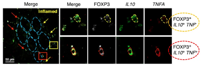 腫瘤壞死因子(TNF)的表達在UC患者中發(fā)生改變,Treg細胞從健康組織向炎癥組織擴展,是炎癥過程中TNF的主要來源。在炎癥組織中,TNF在Treg細胞中誘導(dǎo)表達。研究人員利用RNAscope原位雜交檢測了IL10,TNFA以及Treg細胞標(biāo)志基因FOXP3的表達,驗證了在炎癥組織中Treg細胞中TNF的表達顯著上升(見下圖,白色為RNAscope檢測到的FOXP3的RNA信號,綠色為RNAscope檢測到的IL10的RNA信號,紅色為RNAscope檢測到的TNFA的RNA信號)。