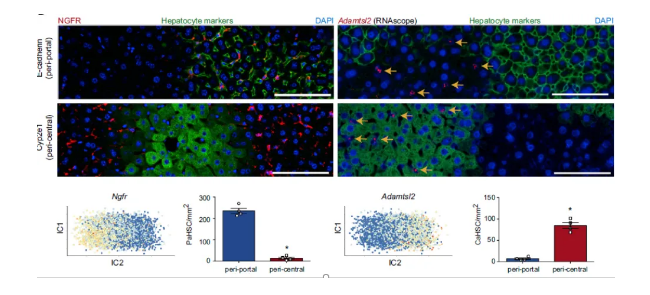 反復(fù)肝損傷導(dǎo)致進行性纖維化,破壞肝臟結(jié)構(gòu),再生潛能以及肝功能。肝星狀細胞(HSCs)是纖維化過程中病理基質(zhì)的主要來源。2019年英國愛丁堡大學(xué)Dobie等人在《Cell Reports》發(fā)表的一篇研究論文將健康小鼠與肝纖維化小鼠的肝間質(zhì)細胞進行單細胞測序分析,揭示了肝小葉中HSCs的空間和功能分區(qū),鑒定了兩種有獨特基因表達特征的不同HSCs細胞亞群[2],一種稱為門靜脈相關(guān)HSCs(PaHSCs),另一種稱為中央靜脈相關(guān)HSCs(CaHSCs)。為了確定這兩種HSCs亞群的空間分布,研究人員進一步利用RNAscope原位雜交技術(shù)檢測了PaHSCs的標(biāo)志基因NGFR與CaHSCs的標(biāo)志基因Adamtsl2的表達(見下圖,左圖紅色為RNAscope檢測到的NGFR的RNA信號,右圖紅色為RNAscope檢測到的Adamtsl2的RNA信號)。通過與免疫熒光技術(shù)結(jié)合,證實了肝小葉中NGFR+ HSCs與門靜脈相關(guān)肝細胞(E-cadherin+)共定位,而Adamtsl2+ HSCs與中央靜脈相關(guān)肝細胞(Cyp2e1+)共定位。