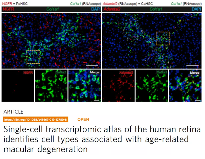 年齡相關(guān)性黃斑變性(AMD)是致盲的主要原因之一,然而,由于該疾病的遺傳復(fù)雜性,使得確定與AMD相關(guān)的細胞類型一直是一個挑戰(zhàn)。2019年來自麻省理工學(xué)院,哈佛大學(xué)與劍橋大學(xué)的研究人員發(fā)表在《Nature Communication》上的一篇研究論文對人視網(wǎng)膜進行了單細胞測序分析,報告了人類視網(wǎng)膜的第一個單細胞轉(zhuǎn)錄圖譜[3]。通過對scRNA-seq數(shù)據(jù)進行分析,研究人員確定了所有主要的視網(wǎng)膜細胞類型,以及它們相應(yīng)的基因表達特征。研究人員通過scRNA-seq首先鑒定了3種不同的大膠質(zhì)細胞亞群,表明人類視網(wǎng)膜神經(jīng)膠質(zhì)比以前認為的要多樣化。3種大膠質(zhì)細胞亞群分別特異性表達FOS,F(xiàn)TL, COL4A3。研究人員進一步使用RNAscope原位雜交技術(shù)驗證并確定了新鑒定的3種大膠質(zhì)細胞亞群的空間分布(見下圖,A圖紅色為RNAscope檢測到的FOS的RNA信號,黃色為RNAscope檢測到的FTL的RNA信號;B圖紅色為RNAscope檢測到的COL4A3的RNA信號,黃色為RNAscope檢測到的FTL的RNA信號;C圖紅色為RNAscope檢測到的COL4A3的RNA信號,黃色為RNAscope檢測到的FOS的RNA信號)。