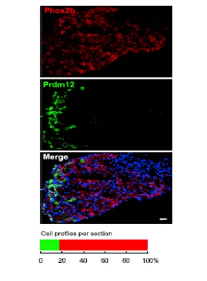 迷走神經(jīng)感覺神經(jīng)元是控制器官功能所必需的,但目前對所涉及的神經(jīng)元類型的復(fù)雜性仍缺乏了解。2019年來自瑞典卡羅林斯卡研究所的研究人員通過scRNA-seq對頸靜脈和結(jié)節(jié)性迷走神經(jīng)節(jié)的神經(jīng)元類型進行了全面的鑒定和分類,鑒定出6種頸靜脈神經(jīng)元和18種節(jié)狀神經(jīng)元[4]。小鼠迷走神經(jīng)神經(jīng)節(jié)復(fù)合體包括神經(jīng)嵴衍生的頸靜脈神經(jīng)節(jié)和基板來源的節(jié)狀神經(jīng)節(jié),轉(zhuǎn)錄因子Phox2b可作為節(jié)狀神經(jīng)元的標(biāo)志物,另一種轉(zhuǎn)錄因子Prdm12可作為頸靜脈神經(jīng)元的標(biāo)志物。在此研究中,單細胞測序鑒定的24個迷走神經(jīng)節(jié)神經(jīng)元細胞群中有18個表達Phox2b,其余6個表達Prdm12。研究人員使用RNAscope技術(shù)進一步地量化分析了分別表達Phox2b與Prdm12的神經(jīng)元的相對比例(見下圖,紅色為RNAscope檢測到的Phox2b的RNA信號,綠色為RNAscope檢測到的Prdm12的RNA信號),結(jié)果表明在469個神經(jīng)元中,386個表達Phox2b,83個表達Prdm12。與單細胞測序結(jié)果一致,表明迷走神經(jīng)神經(jīng)節(jié)復(fù)合體由約85%的節(jié)狀神經(jīng)元與約15%的頸靜脈神經(jīng)元組成。