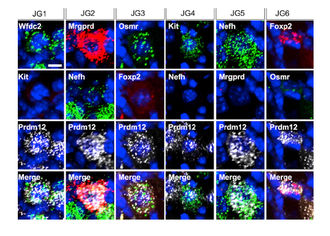 scRNA-seq鑒定的6種頸靜脈神經(jīng)元分別命名為JG1-JG6。6種頸靜脈神經(jīng)元分別有相應(yīng)的特異性表達基因,JG1為Wfdc2,JG2為Mrgprd,JG3為Osmr,JG4為Kit,JG5為Nefh,JG6為Foxp2。為了證實這6種頸靜脈神經(jīng)元在體內(nèi)的分布,研究人員用RNAscope多重?zé)晒庠浑s交進行了驗證,針對不同的神經(jīng)元亞群,分別設(shè)計了兩種探針,一種是每個神經(jīng)元亞群對應(yīng)的特異性表達基因,一種是頸靜脈神經(jīng)元標(biāo)志基因Prdm12,兩種探針聯(lián)合使用,原位鑒定6種不同的頸靜脈神經(jīng)元(見下圖,RNAscope檢測到的Wfdc2,Osmr,Kit,Nefh的RNA信號為綠色,RNAscope檢測到的Mrgprd,F(xiàn)oxp2的RNA信號為紅色,白色為RNAscope檢測到的Prdm12的RNA信號)。