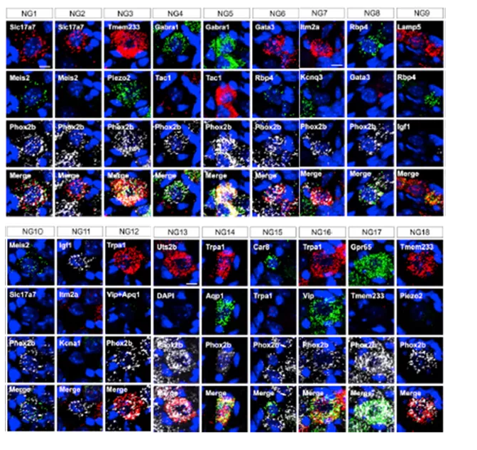 scRNA-seq鑒定的18種節(jié)狀神經(jīng)元分別命名為NG1-NG18,所有節(jié)狀神經(jīng)元類型都有獨特的基因表達模式。研究人員用RNAscope原位雜交的方法檢測18種節(jié)狀神經(jīng)元的特征基因以及所有節(jié)狀神經(jīng)元的共同標(biāo)志基因Phox2b的表達,從空間定位上鑒定了18種不同的節(jié)狀神經(jīng)元類型(見下圖,白色為RNAscope檢測到的Phox2b的RNA信號,綠色和紅色分別為RNAscope檢測到的18種節(jié)狀神經(jīng)元的特征基因的RNA信號)。從而對測序結(jié)果進行了細胞和原位空間分布的驗證。