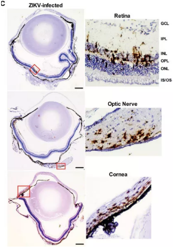 在病毒定位研究中,2015 年巴西寨卡病毒(Zika)爆發(fā)時(shí),華盛頓醫(yī)科大學(xué) Jonathan J. Miner 為首的研究團(tuán)隊(duì)即通過 RNAscope 方法檢測到寨卡病毒在視網(wǎng)膜,視神經(jīng)和角膜中的分布,直觀給出了該病毒在眼內(nèi)的分布圖(見下圖,病毒陽性信號(hào)為圖中的棕色信號(hào)點(diǎn))[1]。