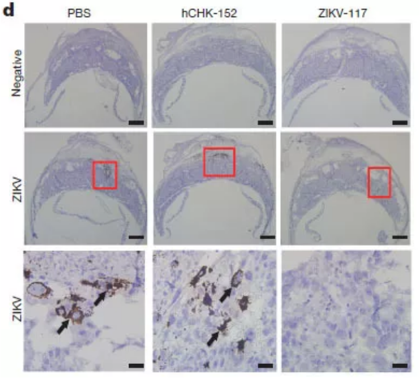 在對(duì)寨卡(Zika)病毒疫苗的研究中,美國 Vanderbilt University 的 Gopal 研究團(tuán)隊(duì)發(fā)現(xiàn)人的單克隆抗體 ZIKV-117 可以有效減低小鼠感染 Zika 后組織的病理特點(diǎn),并通過 RNAscope 檢測試劑盒檢測了注射安慰劑,同型對(duì)照小鼠抗體以及 ZIKV-117 抗體的懷孕小鼠胎盤內(nèi)病毒的分布和數(shù)量,從而證實(shí)了疫苗的效果(見下圖,病毒為圖中的棕色信號(hào)點(diǎn))[2]。