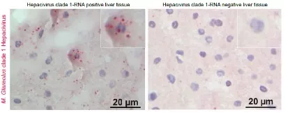 在病毒感染動(dòng)物模型的建立和驗(yàn)證中,Drexler JF 團(tuán)隊(duì)通過 RNAscope 的方法,檢測小鼠肝細(xì)胞內(nèi) HCV 病毒的存在和分布狀況,確認(rèn) HCV 病毒感染動(dòng)物模型建立成功(下圖中的紅色信號(hào)點(diǎn))[4]。