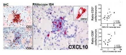 RNAscope 檢測結(jié)果顯示感染過 SVV 之后,伴隨著 CD8 陽性 T 細(xì)胞的聚集,同一區(qū)域表達(dá) CXCL10 細(xì)胞趨化因子,提示 T 細(xì)胞的聚集是由 CXCL10 因子誘導(dǎo)引發(fā)的[4]。