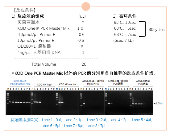上記實(shí)驗(yàn)中,向PCR體系中投入不同濃度的腐殖酸,比較KOD OneTM PCR Master Mix與其他公司的擴(kuò)增效果。結(jié)果表明即使體系中存在高濃度的腐殖酸,KOD OneTM PCR Master Mix也能獲得良好的擴(kuò)增效果,表明該產(chǎn)品對(duì)腐殖酸具有高度耐受性。