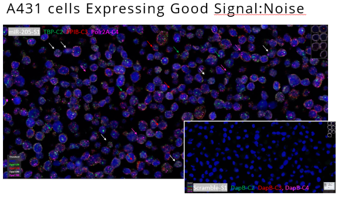 得益于ACD專利的探針設(shè)計及信號放大技術(shù),小RNA分子及mRNA分子的信號最終都可獲得高信噪比。下圖展示在細胞片中對miR-205和3個mRNA的陽性對照探針及陰性對照探針的檢測。陽性對照中各個通道上的信號點清晰,陰性對照中全片非常干凈,體現(xiàn)出方法的高特異性。