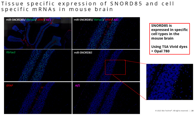在小鼠腦組織切片的檢測中,也可獲得理想的結(jié)果。SNORD85可在小鼠腦某些細胞中特異性表達,下圖中除了對SNORD85進行檢測外,也對小鼠的神經(jīng)元(Rbfox3)、星形膠質(zhì)細胞(GFAP)、小膠質(zhì)細胞(Aif1)同時進行檢測,可見不同靶標(biāo)特異的定位特征。