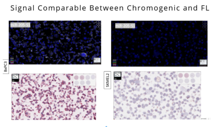 針對同一個miR-205分子,對比使用RNAscope Plus的熒光信號與使用可見光試劑盒miRNAscope的可見光紅染信號,二者對于miR-205不同表達豐度的細胞中小RNA分子的檢出結(jié)果有較高的一致性,證明不同的顯色方式對于靶標(biāo)的檢測沒有影響。