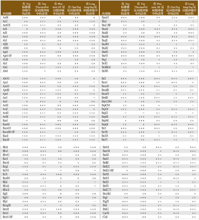 通常,PCR 反應(yīng)后還要對產(chǎn)物進(jìn)行酶切才能進(jìn)行下一步工作。為了方便起見,可以將內(nèi)切酶直接加到 PCR 反應(yīng)產(chǎn)物中,而省略純化 PCR 產(chǎn)物的步驟。下表歸納了在 Taq、Phusion*、OneTaq 和 LongAmpTaq PCR 產(chǎn)物混合物中各種限制性內(nèi)切酶的酶切活性。50 μl 反應(yīng)體系中,將 5 單位內(nèi)切酶加入到 PCR 反應(yīng)產(chǎn)物中,在適當(dāng)?shù)臏囟认路磻?yīng) 1 小時,凝膠電泳分析酶活性。PCR 反應(yīng)產(chǎn)物中包括:1X ThermoPol 反應(yīng)緩沖液、標(biāo)準(zhǔn) Taq 反應(yīng)緩沖液、Phusion HF 反應(yīng)緩沖液、OneTaq 標(biāo)準(zhǔn)反應(yīng)緩沖液或 LongAmpTaq 反應(yīng)緩沖液,含 dNTPs(終濃度為 200 μM)、1 μg DNA 和 1 單位 Taq DNA 聚合酶。