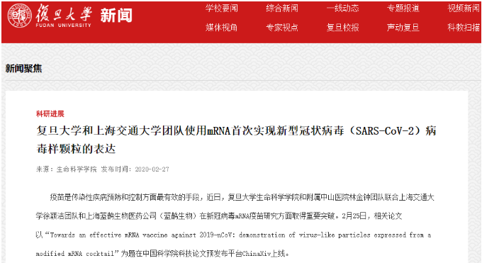 今天,復(fù)旦大學(xué)和上海交通大學(xué)在預(yù)印本網(wǎng)站ChinaXiv上,聯(lián)合報告了針對新型冠狀病毒SARS-CoV-2的mRNA疫苗研發(fā)的最新進展,上海APExBio、藍鵲生物技術(shù)有限公司和廣州中山大學(xué)醫(yī)學(xué)中心也參與了該項目。